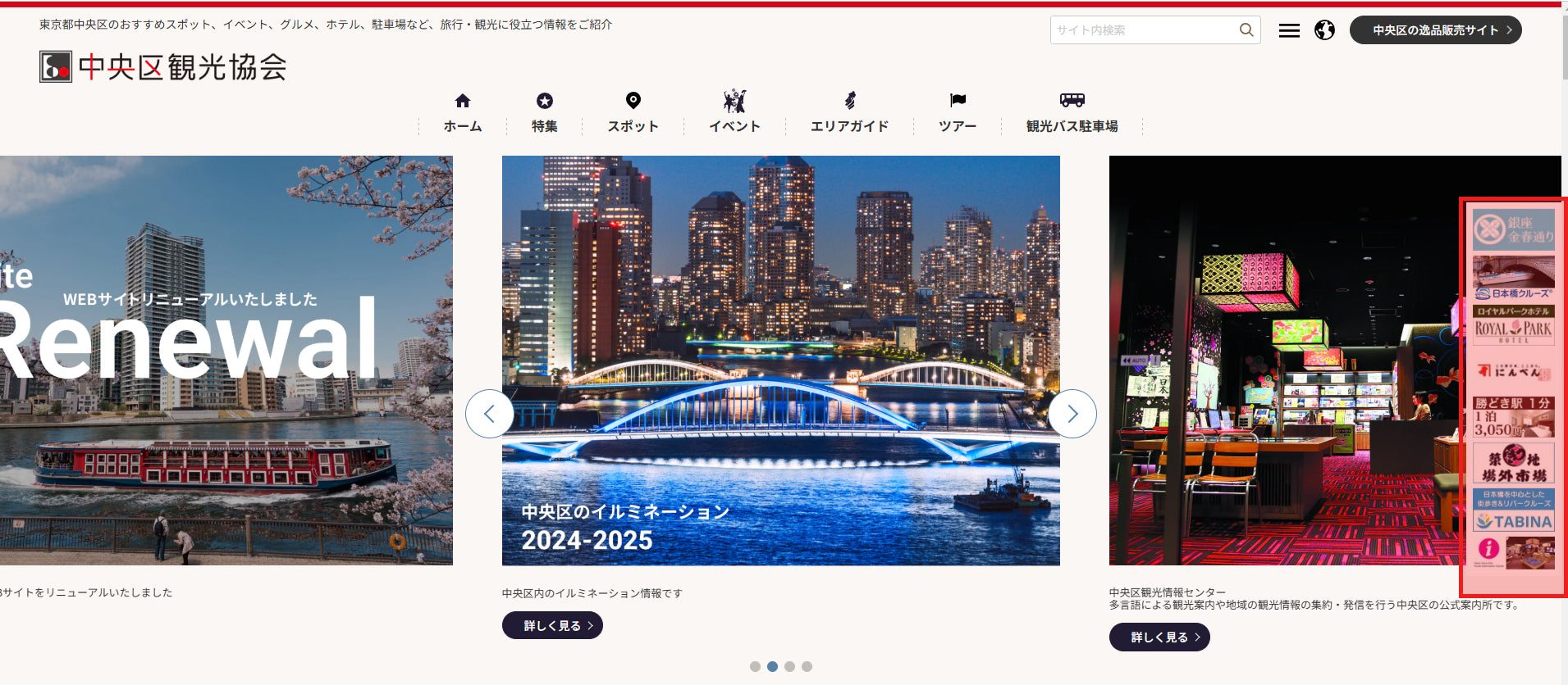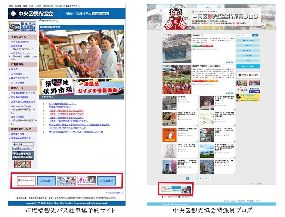 The Chuo-ku Tourism Association is looking for banner ads on the Chuo-ku Tourism Association website and the Ichiba Bridge Parking Reservation Site.
