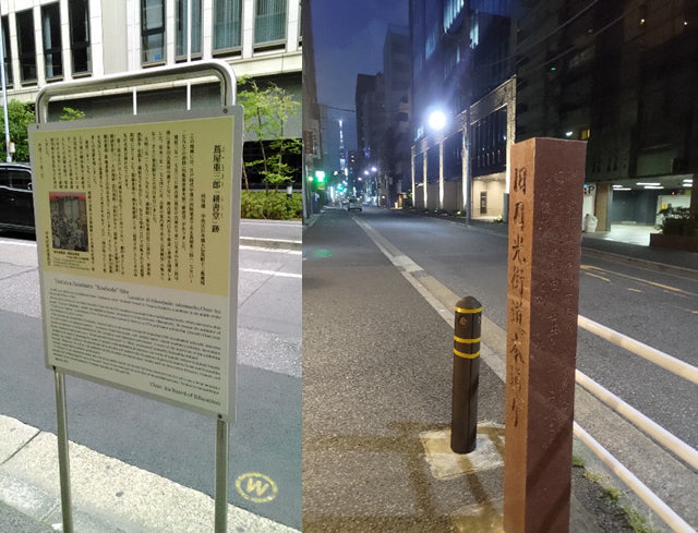 (Left) Explanation board of the site of Koshodo in present-day Odenma-cho, Nihonbashi, Chuo-ku