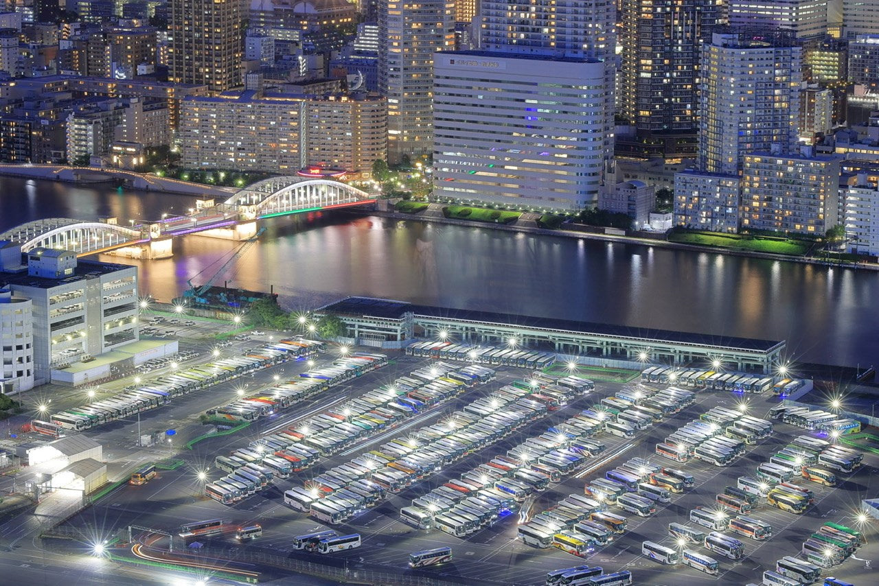 The Tokyo 2020 Games were held in 2021. When I headed to the observation deck overlooking the city, there were many Olympic transport buses waiting on the site of Tsukiji Market. I was lucky to meet the sight that I couldn't notice from the ground, and I was able to shoot. (Photo from observation deck Shiodome, Caretta)