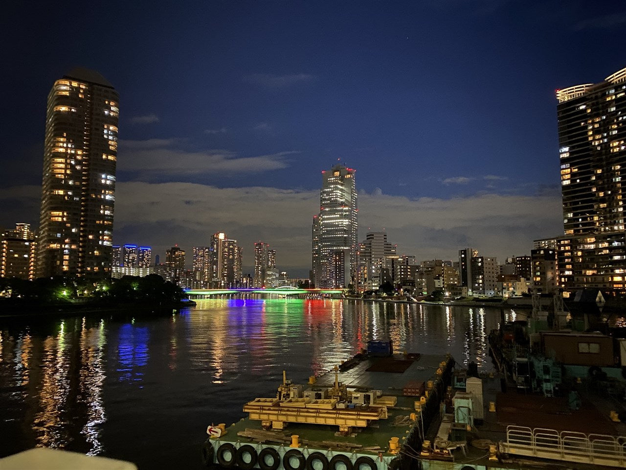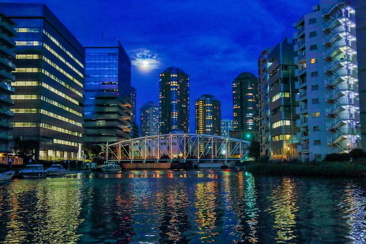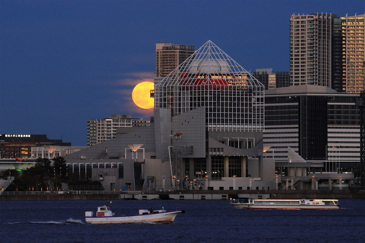 On the night of the full moon, I checked the time and direction of the moon on the official website of the National Astronomical Observatory of Japan in advance and waited for the moon to appear. As I was photographing the orange moon, I was lucky enough to see two ships and released the shutter without missing the moment. (Photo from Shinhinode Bridge)