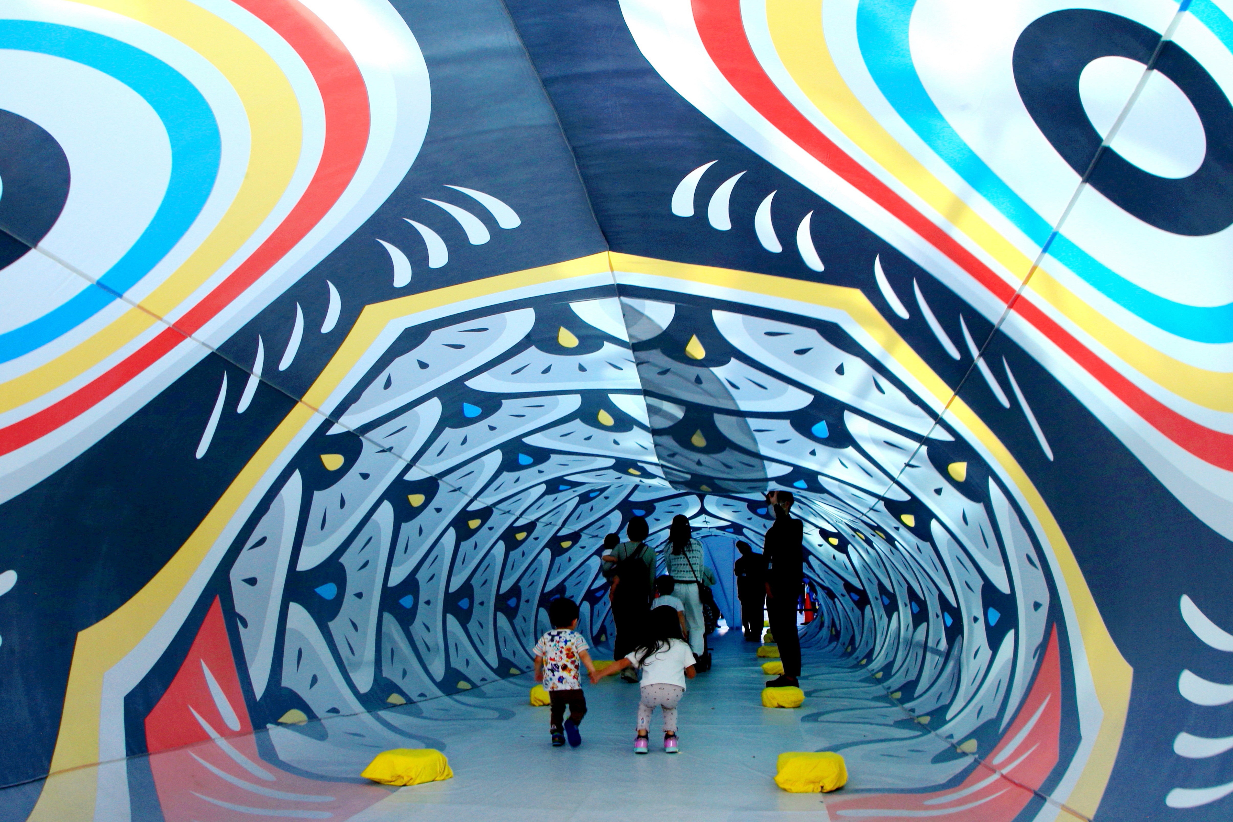 A giant carp streamer placed on the ground. The inside of the mouth with a difference in light and darkness was clearly visible with the lens selection and accurate exposure. The eyes of the carp at the top of the screen are cut irregularly to enhance the oddness. This is the first time I have seen a carp streamer on earth. It is cute to look around while feeling interest and anxiety.