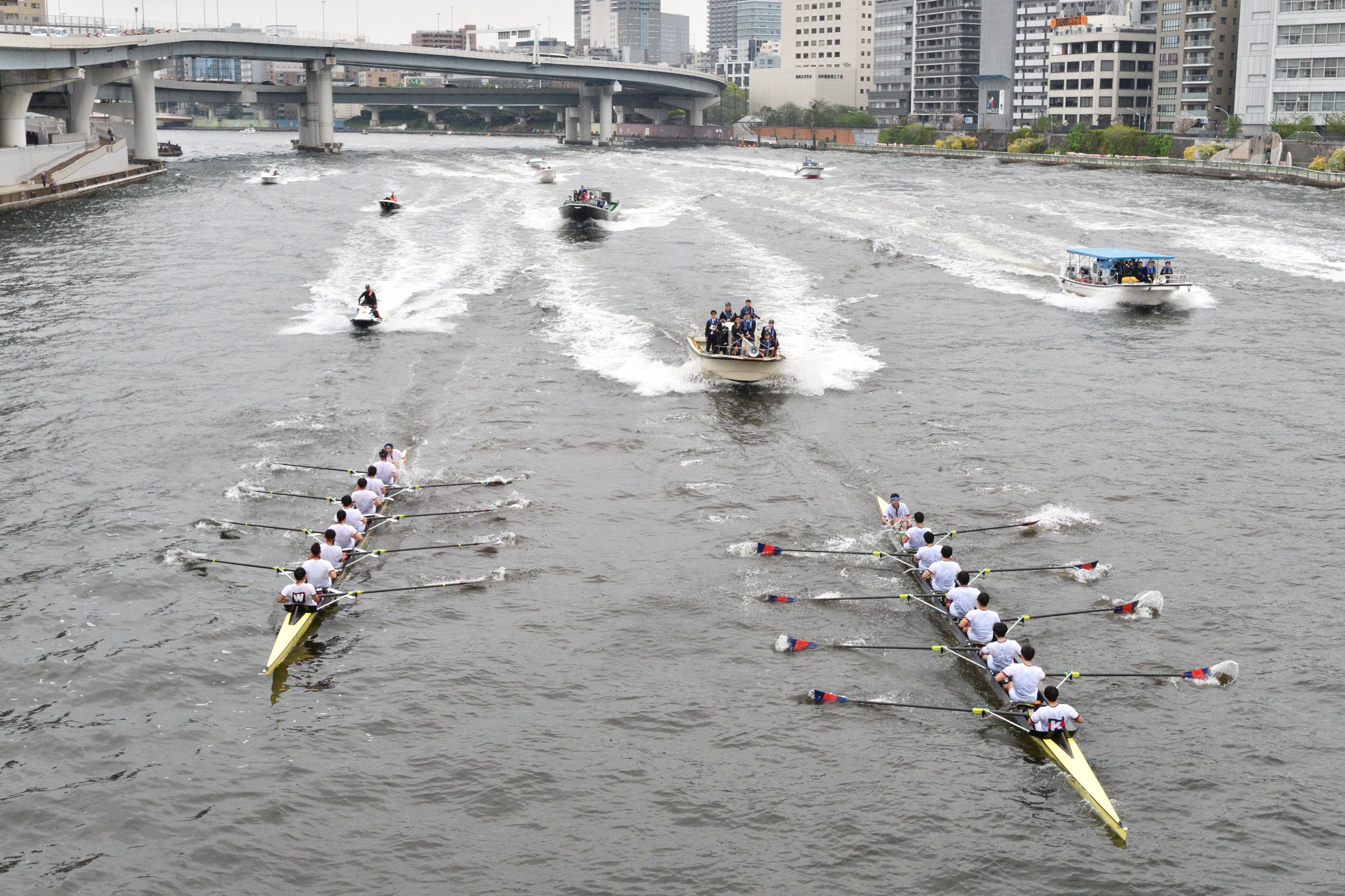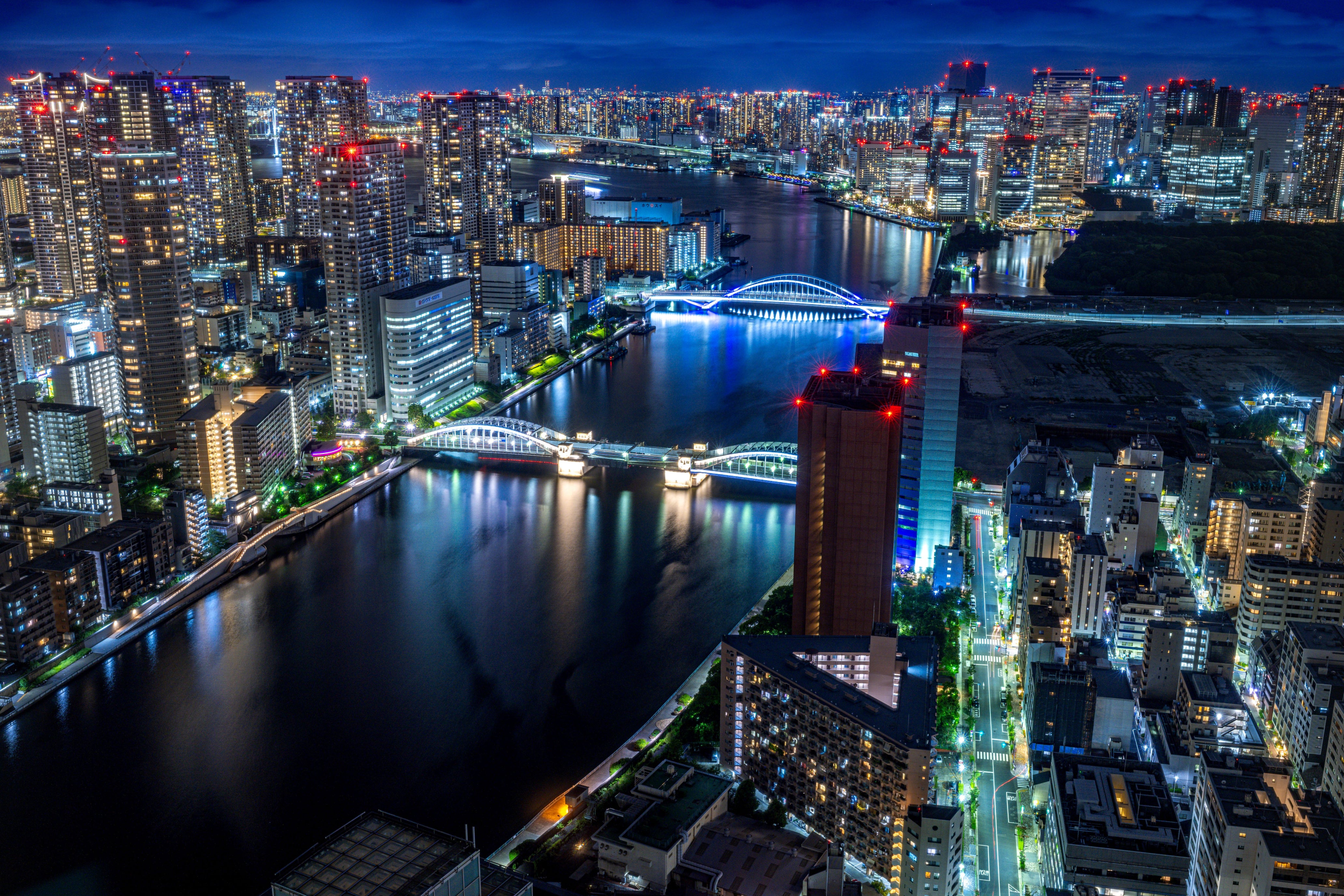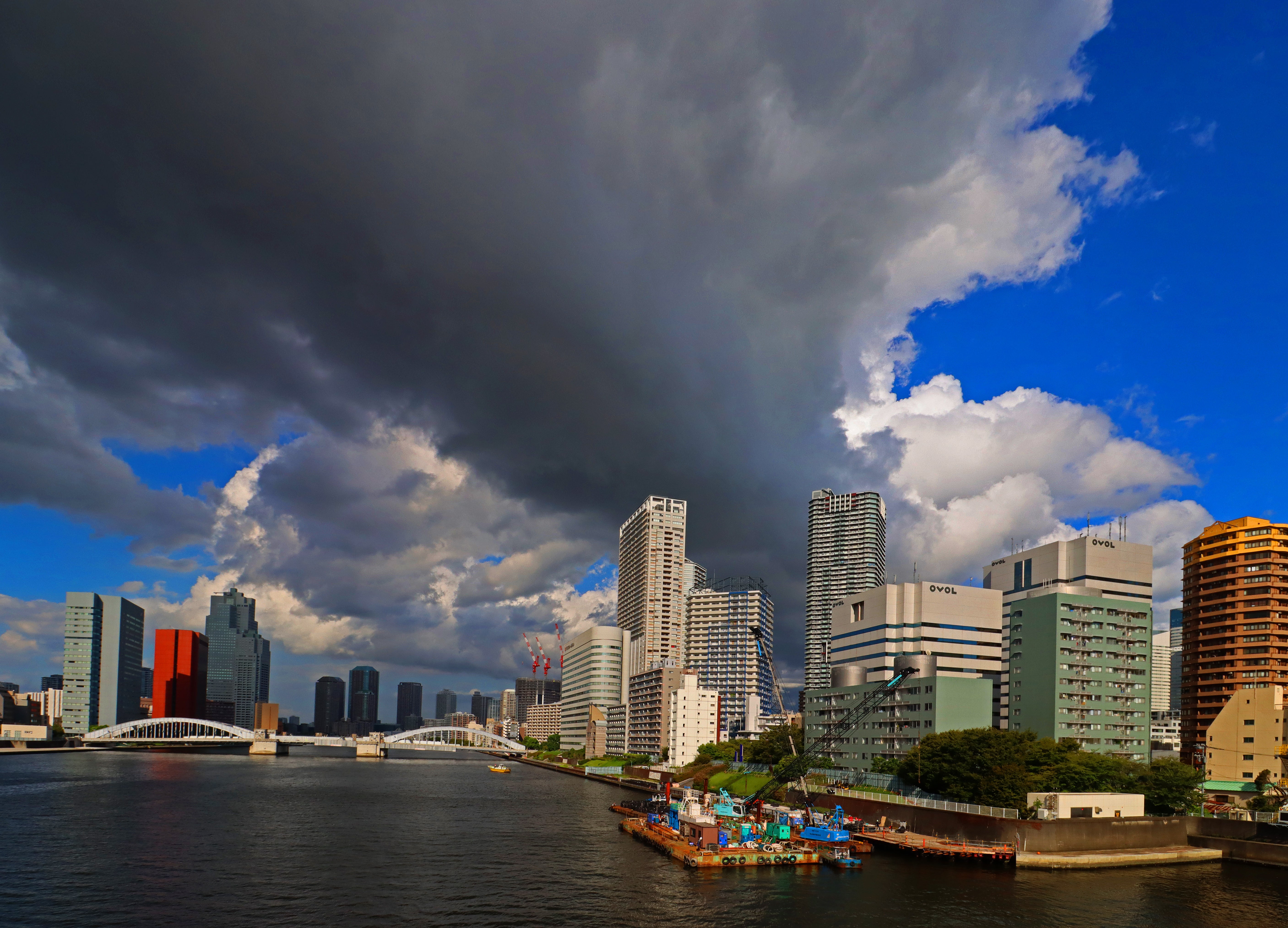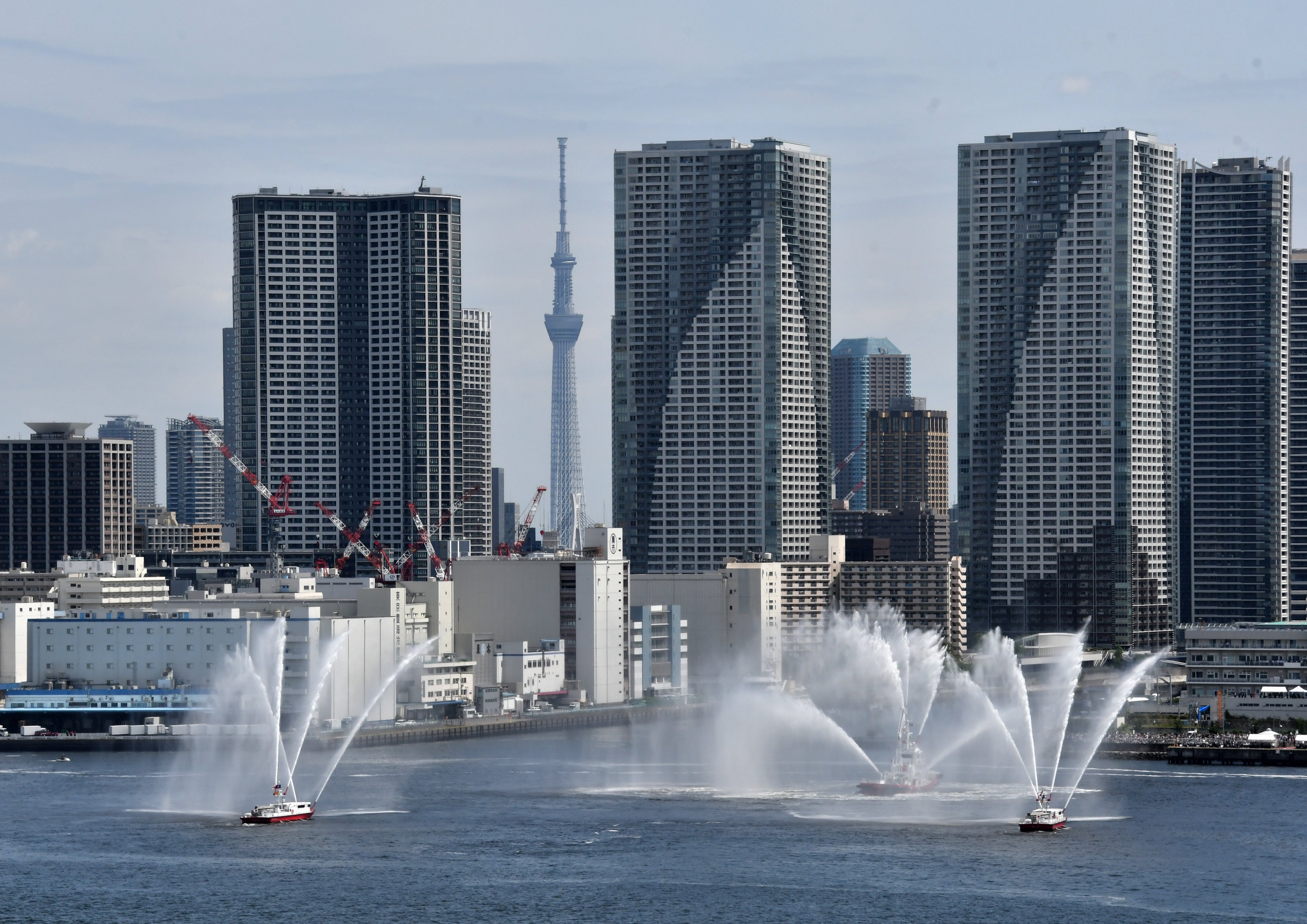 The contrast between the straight structure of the high-rise building and the curve by the water discharge of the fire boat was comfortable, and the light and dark contrast was arranged with moderate contrast. The accent effect of Skytree is also accurate.