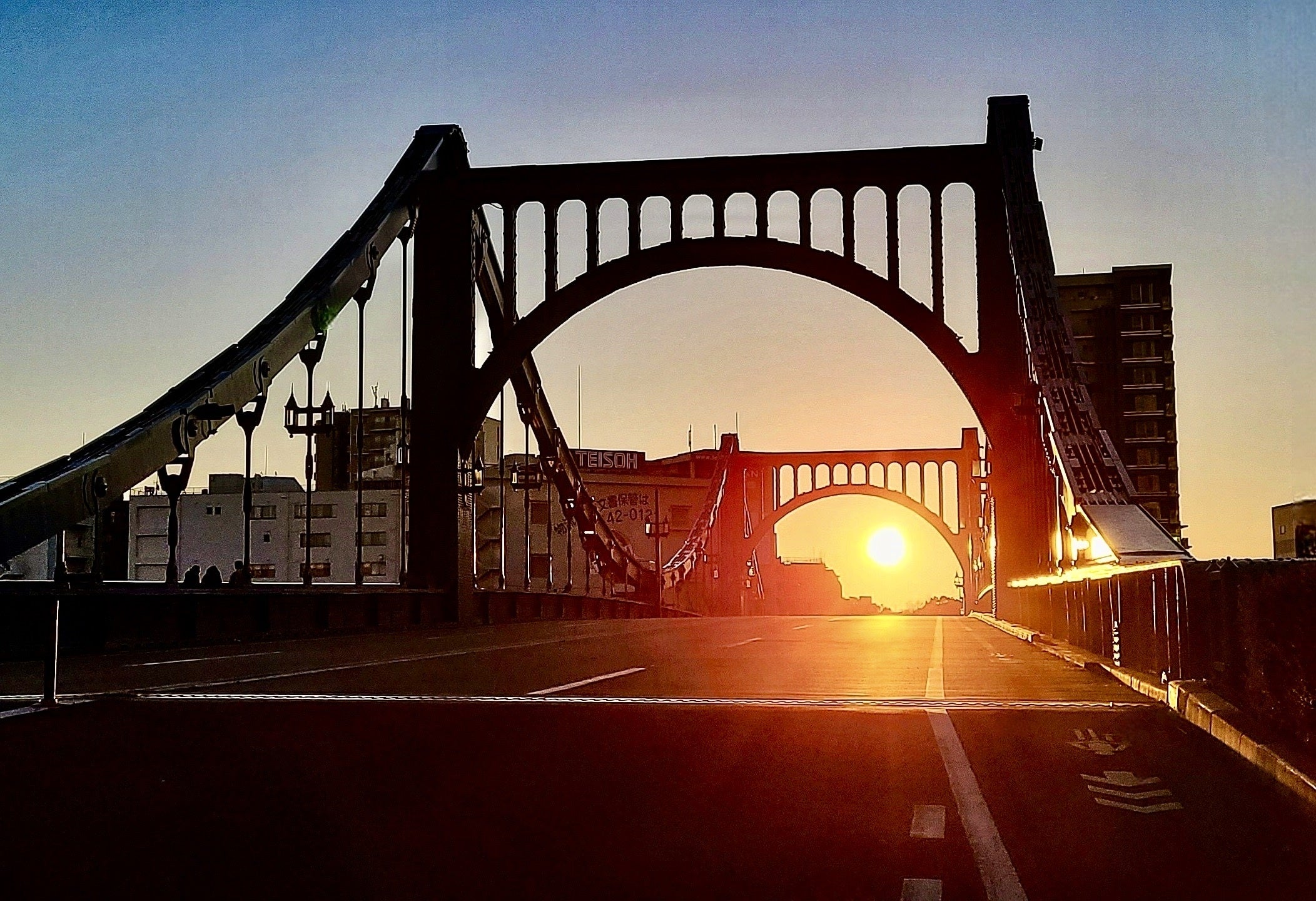 The bridge shot with the telephoto lens draws the bridge girder on the opposite shore by compression depiction, and beautifully depicts the weight and curve composition. The sun shines brightly and dyed the bridge beautifully. The atmosphere of the New Year is wonderful.